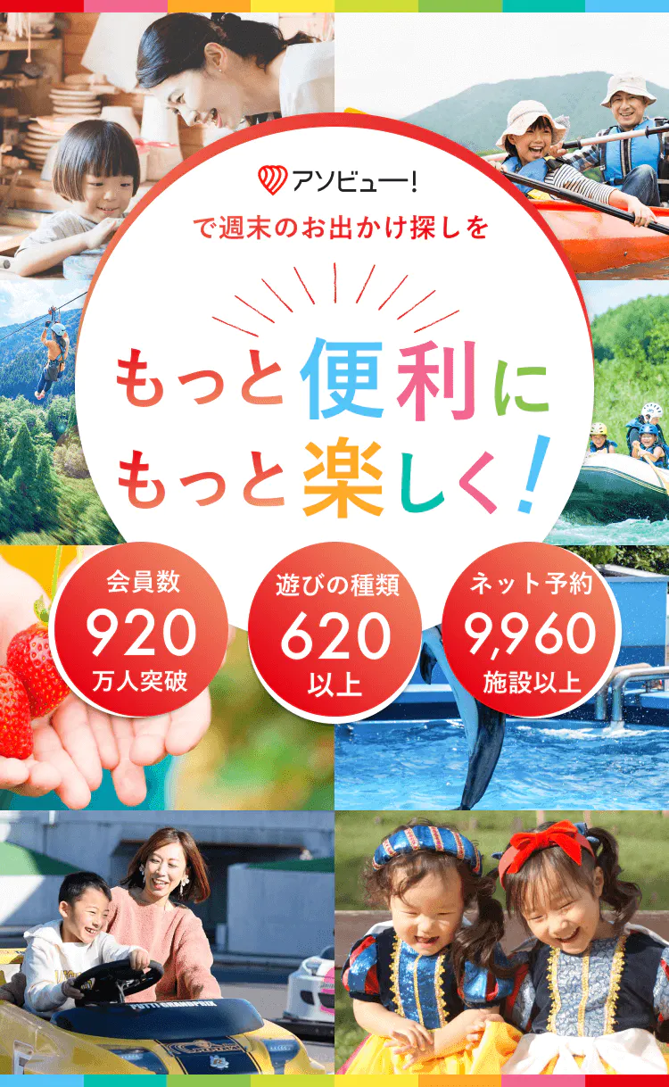 アソビュー!は会員登録無料で、日本全国の遊べる施設を便利でお得に予約できるサービスです。